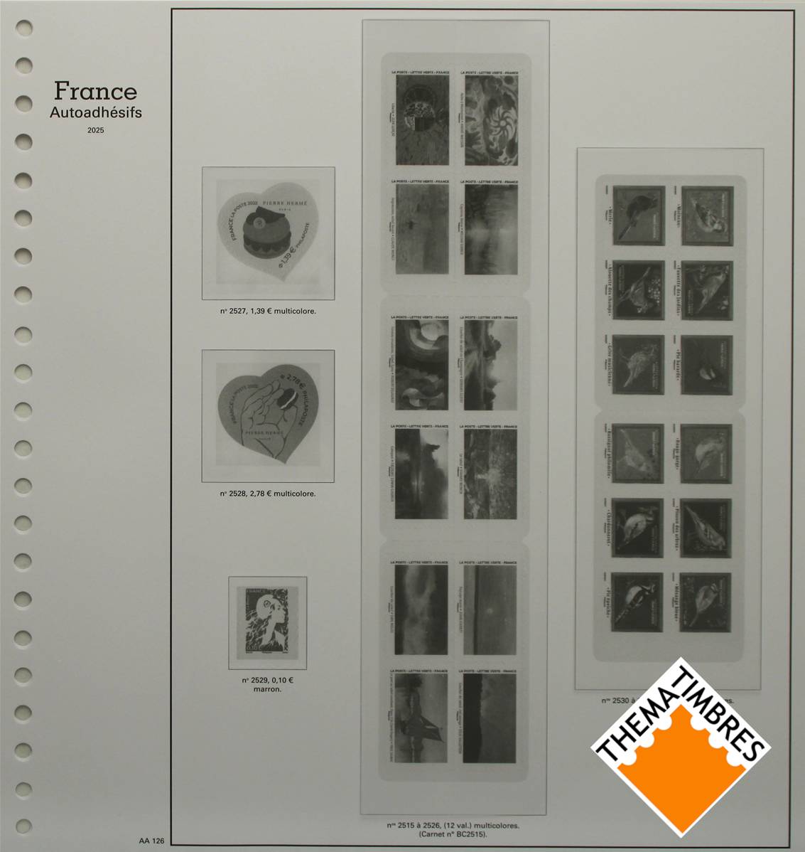 3 pages (AA 126 à AA128) pour les timbres autoadhésifs (seuls ou en carnet) émis au 1er semestre 2025 (du numéro 2515 au numéro 2595.)