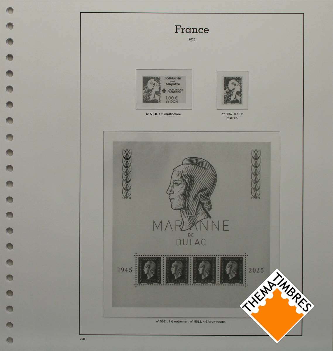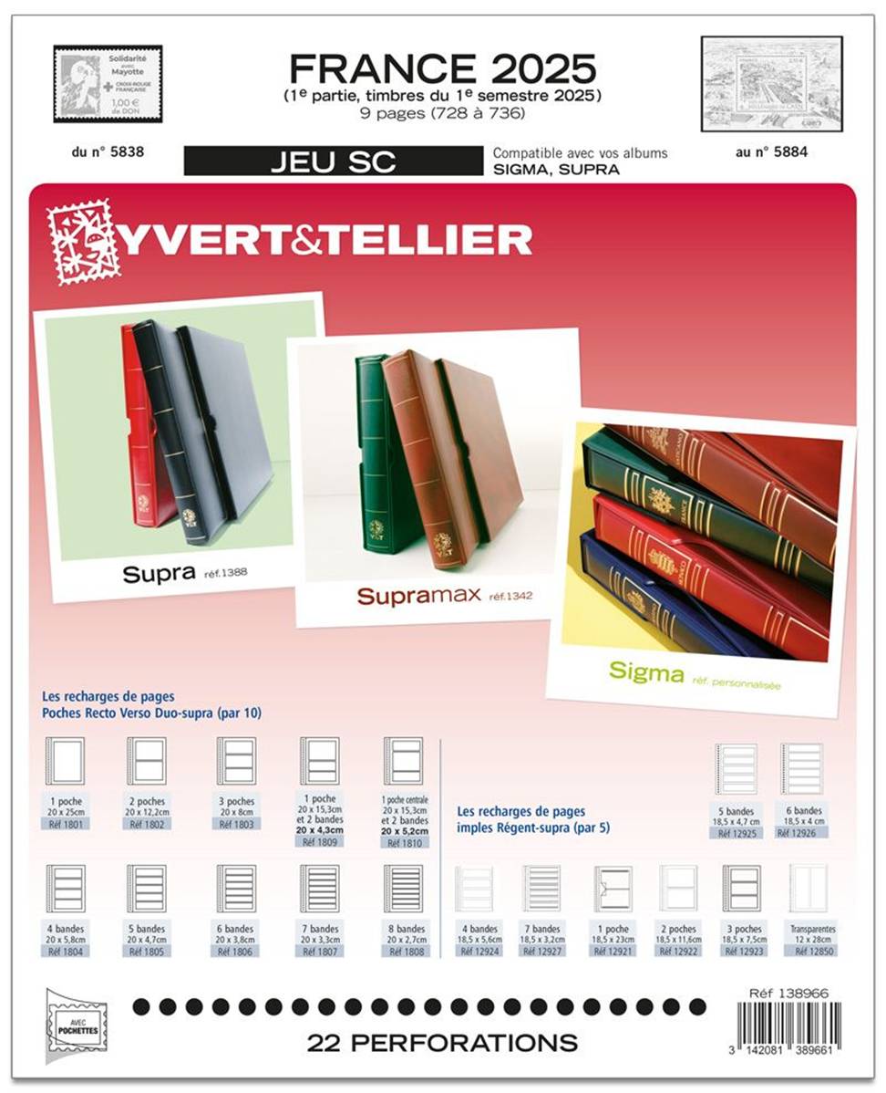 9 pages (728 à 736) pour les timbres gommés, blocs gommés et carnets gommés émis au 1er semestre 2025 (du numéro 5838 au numéro 5884.)